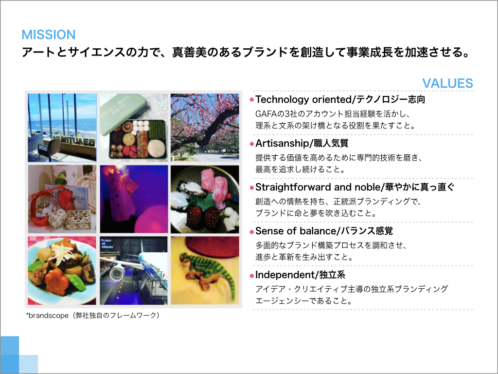 下記のスライドが弊社の独自のフレームワーク「brandscope」などを活用して開発した弊社のMVVです(弊社はVは戦略的に非公開にしてます)。MVV開発に取り組んだ際に、想像以上の苦悩と直面しました。最大の壁は「自己のアイデンティティと真摯に向き合うこと」。大きな心理的負荷を伴う葛藤がありました。ですが、この心理的負荷から逃げずに徹底的に言葉と真理を探究したことで、「マスターマイセルフ」という境地に達することができました。自分で体験してみないと分からないことがあると思います。この体験でクライアントがMVV 開発で直面するであろうすべての葛藤、不安、そして困難を、心から理解し真の伴走者としてサポートできると確信しています。